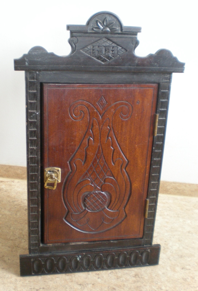 Hornskápur, hæð 50 cm, breidd 29.5 cm og dýpt 16 cm. Skápurinn er með dökkbrúnum ramma og ljósari við í hurð. Hann er útskorinn að framanverðu, það gerði Björn Jakobsson 1931. Björn er f. 5/6 1894, d. 17/8 1977.