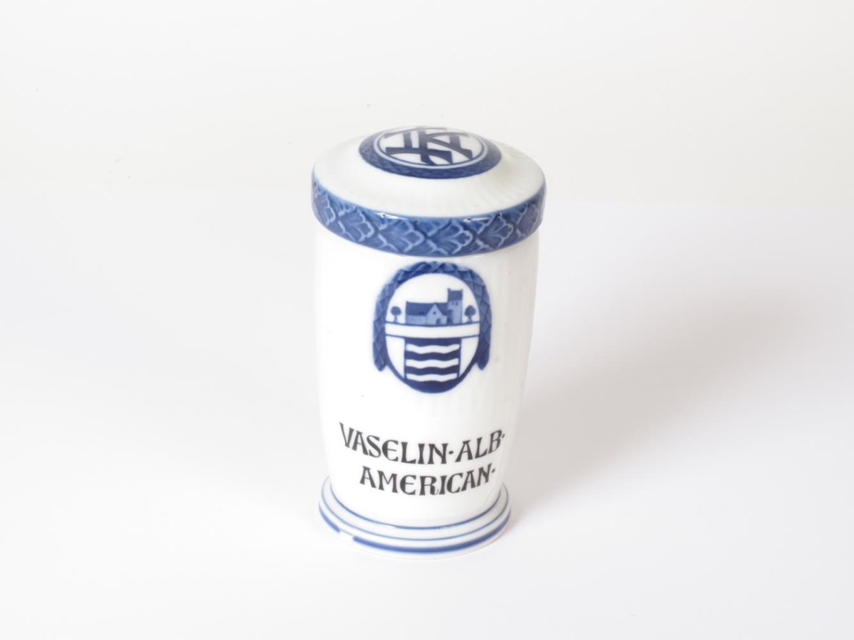 Lyfjakrukka úr Holte apóteki í Danmörku. Framan á krukkunni stendur "Vaselin-Alb-American" og þar yfir er egglaga krans með kirkju innan í sem mun vera gamla skjaldamerki Sölleröd (kirkjan er Söllerödkirkja) sem í dag er, ásamt Holte, hluti af bæjarfélaginu Rudersdal norðan Kaupmannahafnar. Á lokinu eru upphafsstafir Holte apóteks "H A" Krukkan er hönnuð af Martin Nyrop árið 1920 fyrir Den Kongelige Porcelainsfabrik. Fyrsta apótekarakrukkan af sama tagi er frá árinu 1913 og er hönnuð fyrir Frederiks Apotek. Árið 1922 var samskonar krukkur útbúnar fyrir Reykjavíkurapótek og nú eru varðveittar í Lyfjafræðisafninu í Nesi. Fálkamerkið er framan á krukkunum úr Reykjavíkurapóteki og á lokinu eru upphafstafir apóteksins, "R A". Fálkamerkið var skjaldamerki Íslands á árunum 1903-1919, og í konungsfána Íslands sem var tekinn upp árið 1920. Árið 1921 var hin íslenska fálkaorða stofnuð.