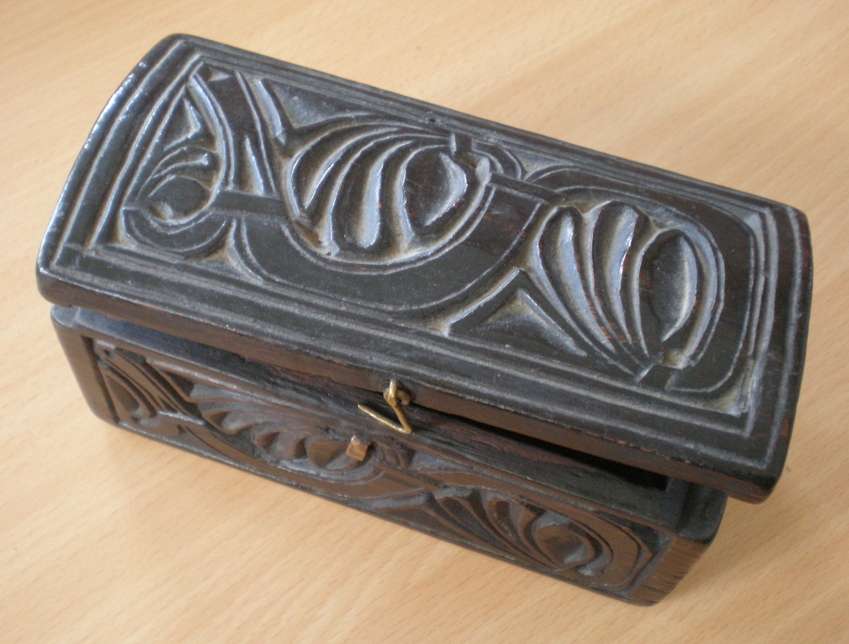 Stokkurinn er 14,5 cm. á lengd, 6,5 cm. á breidd og 7,5 cm. á hæð. Hann er svartlitaður og útskorinn.