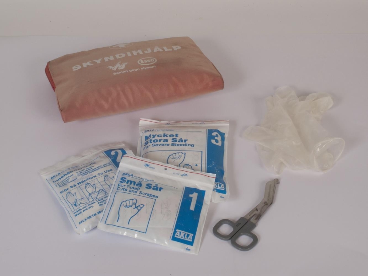 Neyðarpúði appelsínugulur að lit. Púðinn er n.k. veski með rennilás sem inniheldur plástra, þurrkur og annað sem notað er við skyndihjálp. Var lengi í bíl og þess vegna upplitaður af sól. Allt upprunalega innihaldið er enn í neyðarpúðanum. Þ.e. 3 plastpoka sem hver um sig inniheldur sjúkravörur til meðhöndlunar á litlu, stóru og mjög stóru sári. Einnig skæri, öryggishanskar, leiðbeingar fyrir skyndihjálp, límmiða sem á stendur: "Í þessum bíl er skyndihjálp". Auk þess er í neyðarpúðanum lítið spjald til þess að panta íhluti. Verðin sem þar koma fram giltu fyrir árið 1994. Á annarri hlið púðans stendur með hvítu letri: VÍS ESSO/ Saman gegn slysum.SKYNDIHJÁLPInnihald neyðarpúðans á að vera auðvelt í notkun fyrir algengustu tegundir sára. Skýrar leiðbeiningar eru utan á umbúðunum. Neyðarpúðinn byggir á 1 - 2 - 3 kerfinu, sem flýtir fyrir markvissri skyndihjálp.Poki 1 fyrir lítil sár:6 sótthreinsiklútar, 2 sáraþurrkur. Plástur í mismunandi stærðum.Poki 2 fyrir stór sár:4 sótthreinsiklútar, 2 sáraþurrkur, 1 sótthreinsað sárabindiPoki 3 fyrir mjög stór sár:1 stórt sóttheinsað sárabindi, 1 grisjubindi.Annað: Skæri, 1 par af öryggishönskum úr vinyl. Leiðbeiningar í skyndihjálp. Límmiði á bílrúðu Á hinni hlið púðans stendur með hvítu letri: SKYNDIHJÁLP / VÍS [Vátryggingafélag Íslands] ESSO / Saman gegn slysum