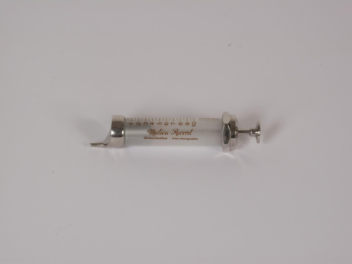 Glersprauta. 10 ml. Record-stútur og stimpill eru úr málmi. Stútur sprautunnar er á kanti sprautunnar.Kvarði: 10 mlÁ sprauturnar er prentað: " Medica Record / Made in Germany / auswechselbar - Interchangeable. Einnig merki framleiðandans.