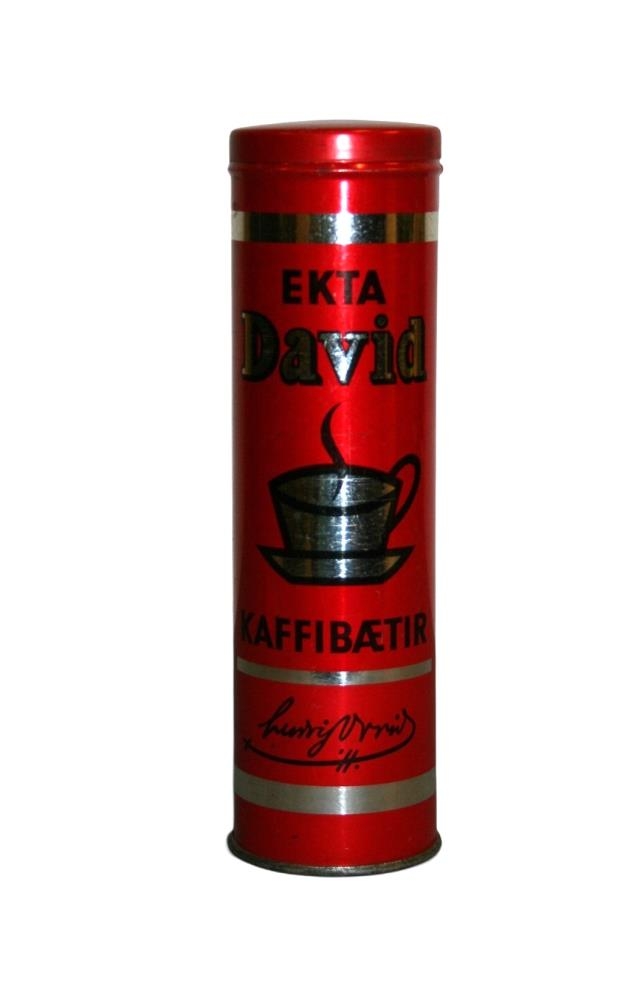 Kaffibætisbaukur, ekta David kaffibætir. Rauð sívöl blikkdós með loki.