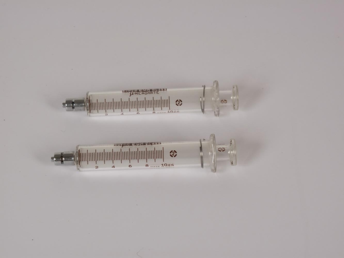 Glersprauta. 10 ml. með Luer-lock stút og fjöður úr stáli. Tvö stykki.Kvarði: 10 ccÁ sprautuna er prentað: "Super Eva Glass, Interchangable, µ-micromatic, Made in Italy"