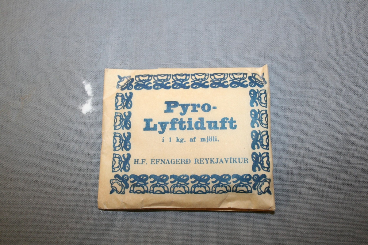 Pyro-Lyftiduft í 1 kg. af mjöli. Framleiðandi Hf Efnagerð Reykjavíkur.
