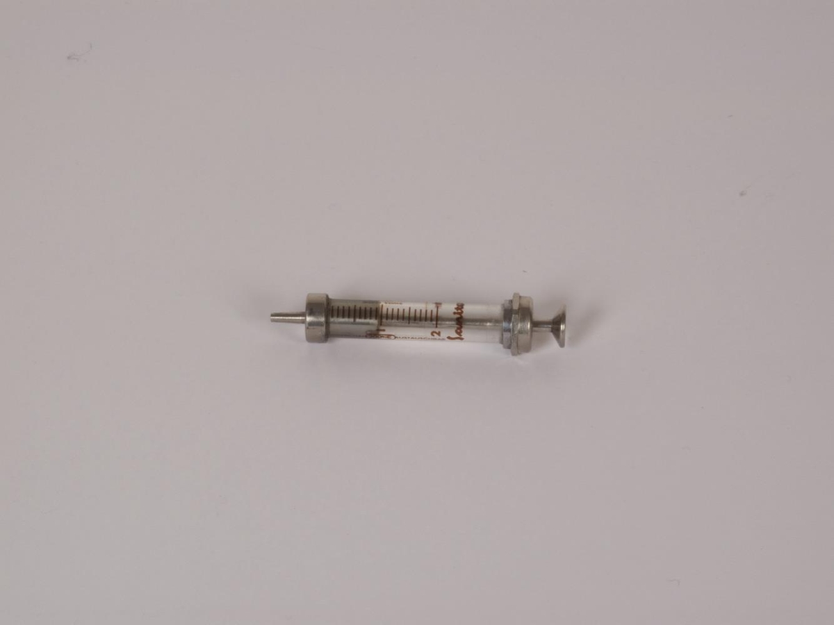 ítölsk glersprauta. 2 ml. með Recordstút og stimpil úr málmi.Kvarði: 2 mlÁletrun á sprautu: "Interchangeable -aystayscgbar 200°C, Swiss Made"