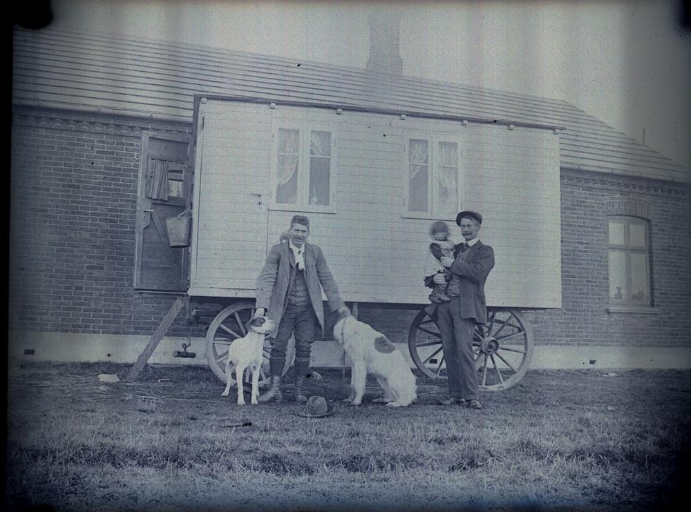 Tveir karlmenn, stúlkubarn og tveir hundar fyrir framan húsvagn.