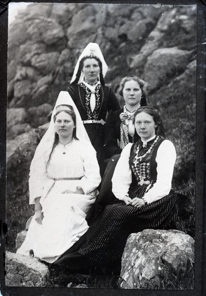 Fjórar konur á íslenskum búning, efst til vinstri í skautbúning, efst til hægri í peysufötum, neðst til vinstri í kyrtli og neðst til hægri í upphlut, myndin tekin í Flatey. (eftirtaka)