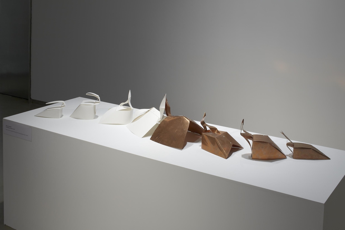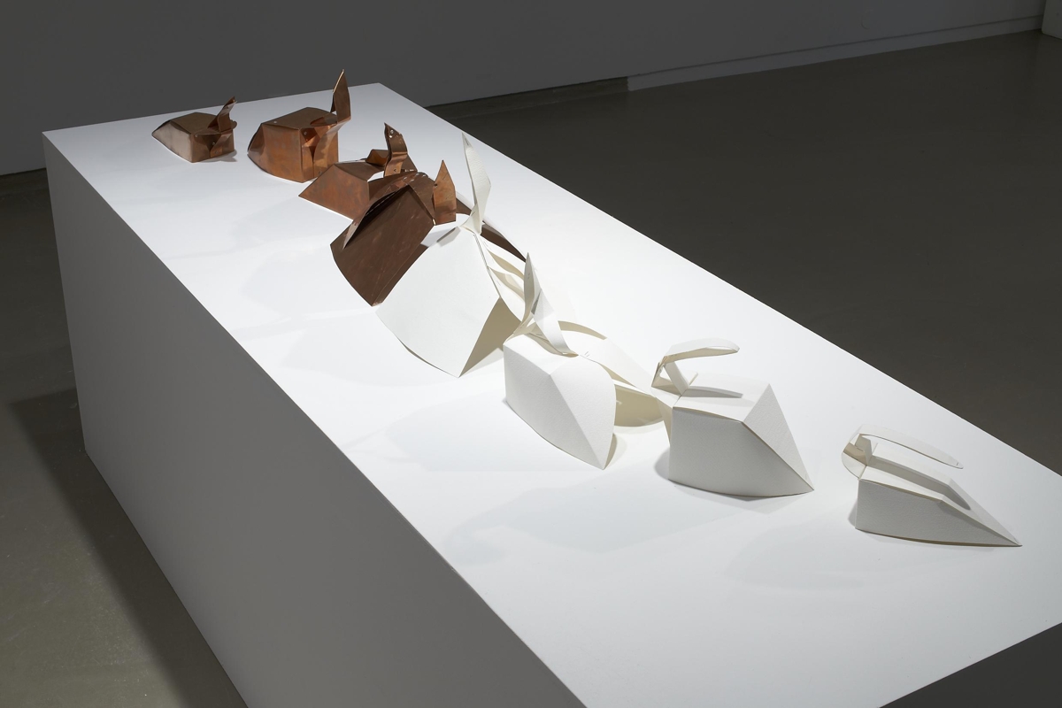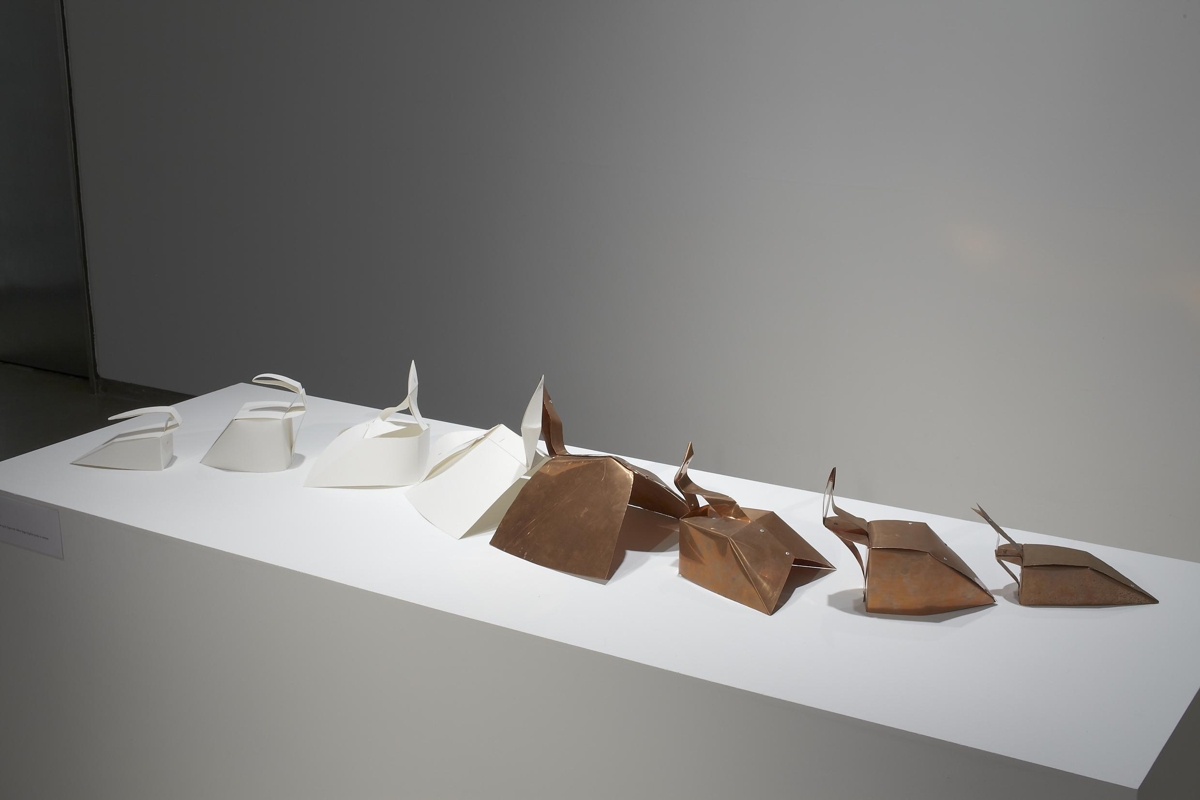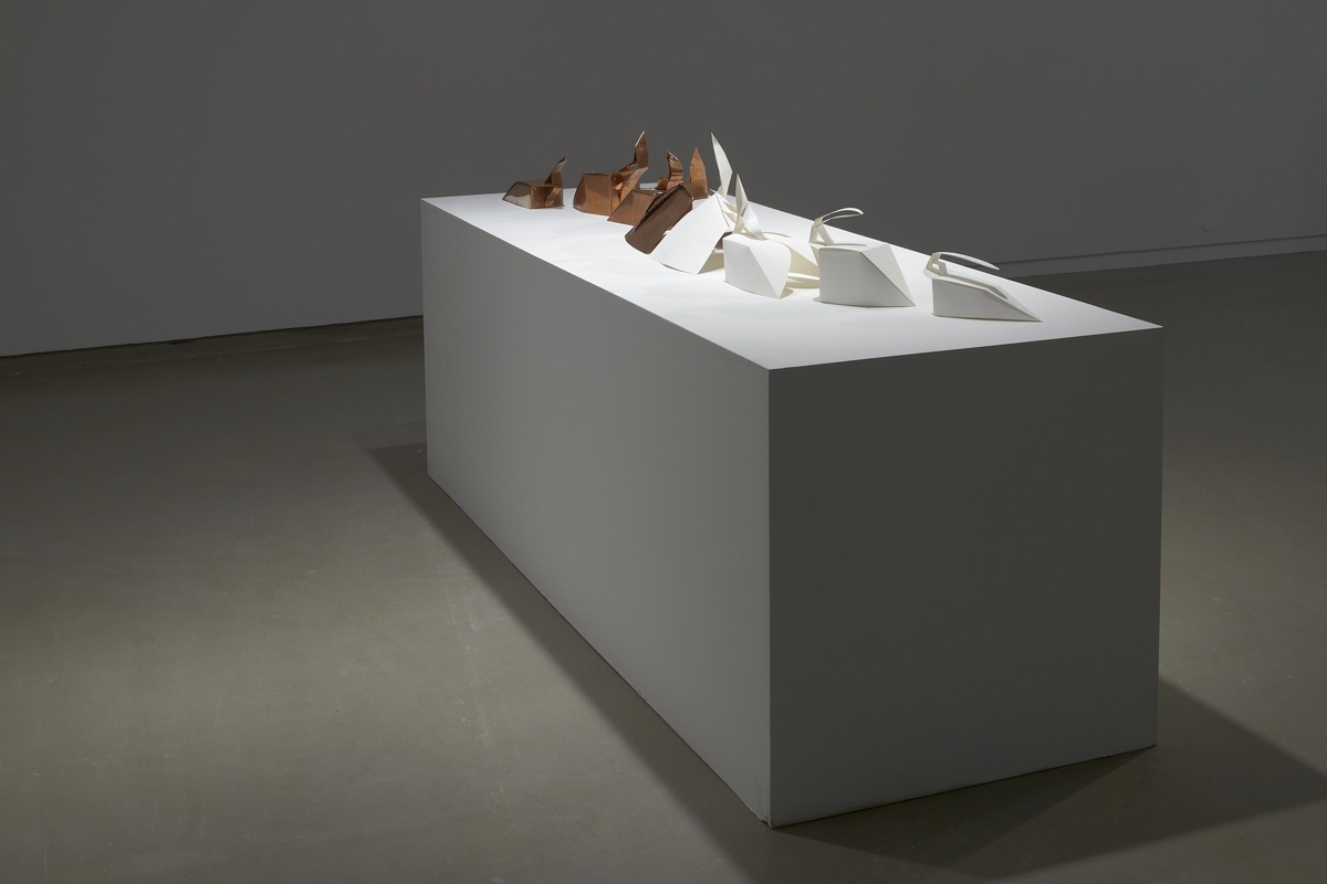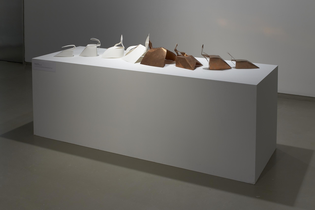 Verk í 8 einingum, kopar og þykkur hvítur pappír, 4 af hvoru ásamt eftirfarandi texti: Eins er um línið sem straujárnið sléttar og þá lygnu sem vaknar þegar fuglinn syndir á vatninu.