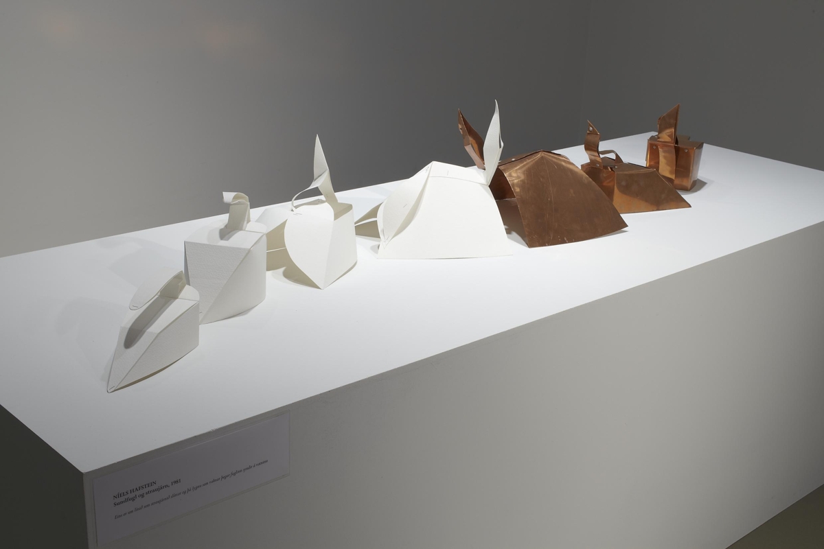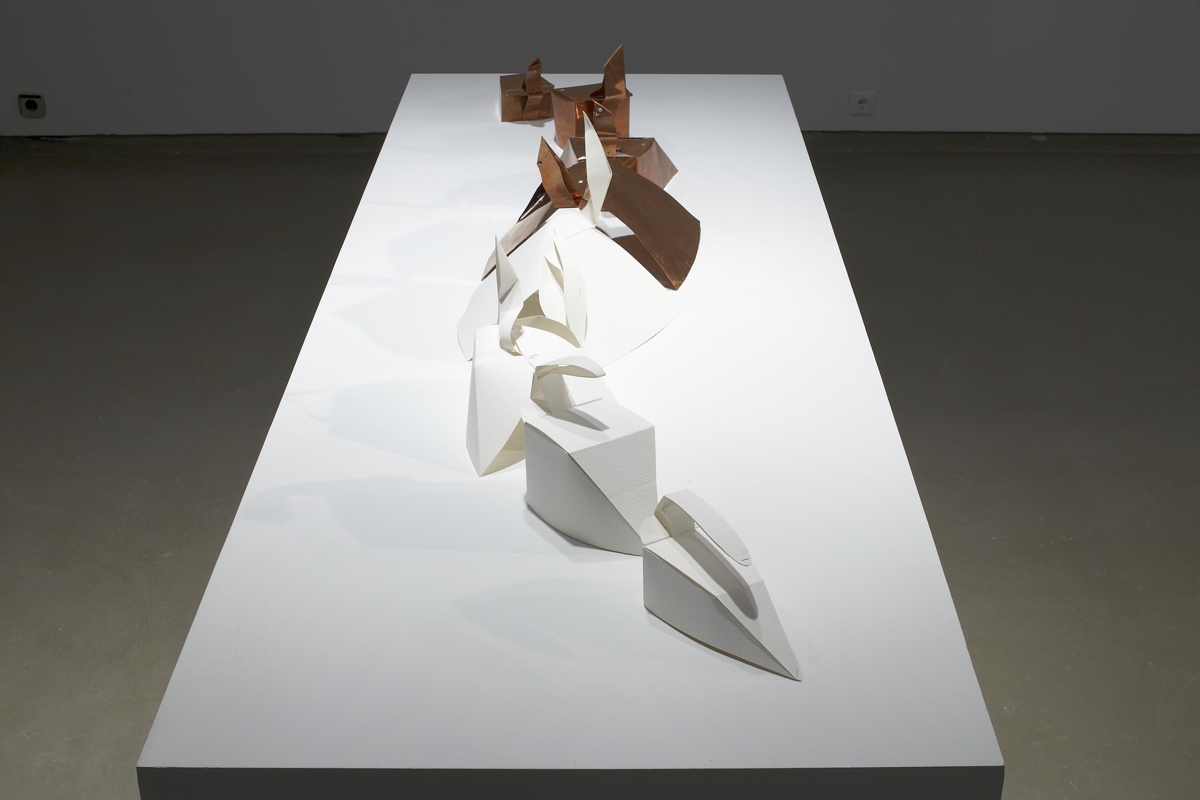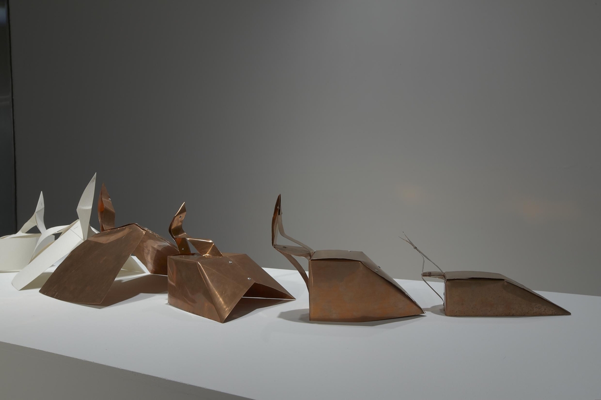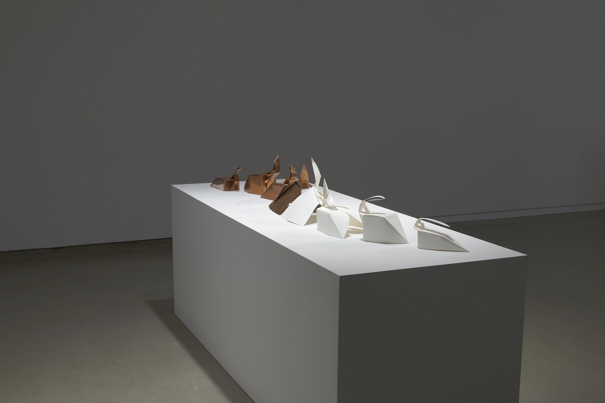 Verk í 8 einingum, kopar og þykkur hvítur pappír, 4 af hvoru ásamt eftirfarandi texti: Eins er um línið sem straujárnið sléttar og þá lygnu sem vaknar þegar fuglinn syndir á vatninu.