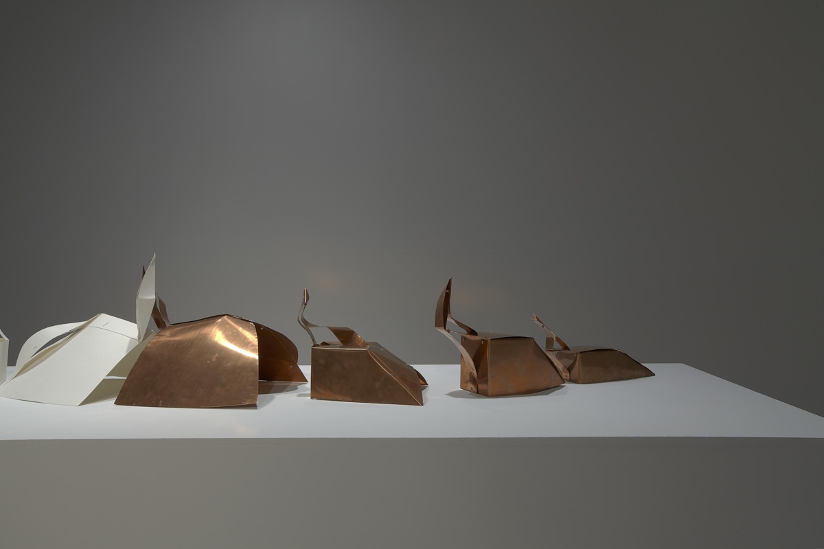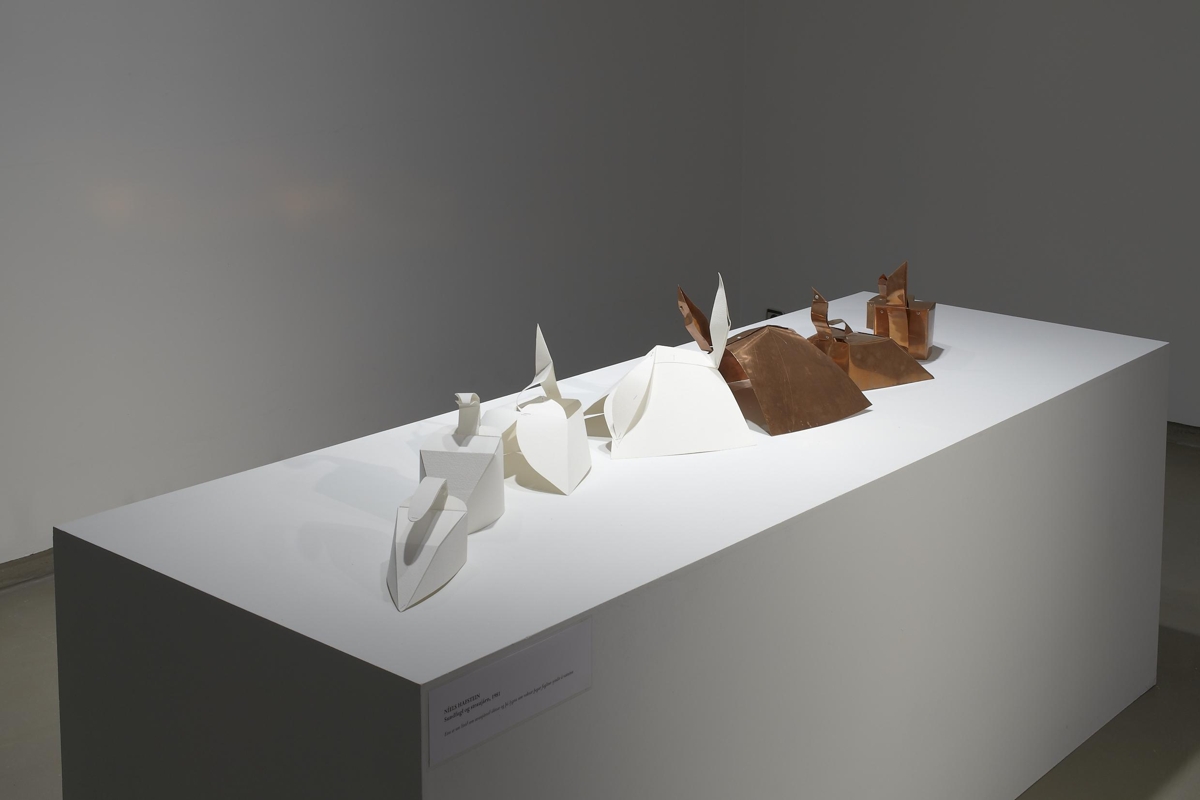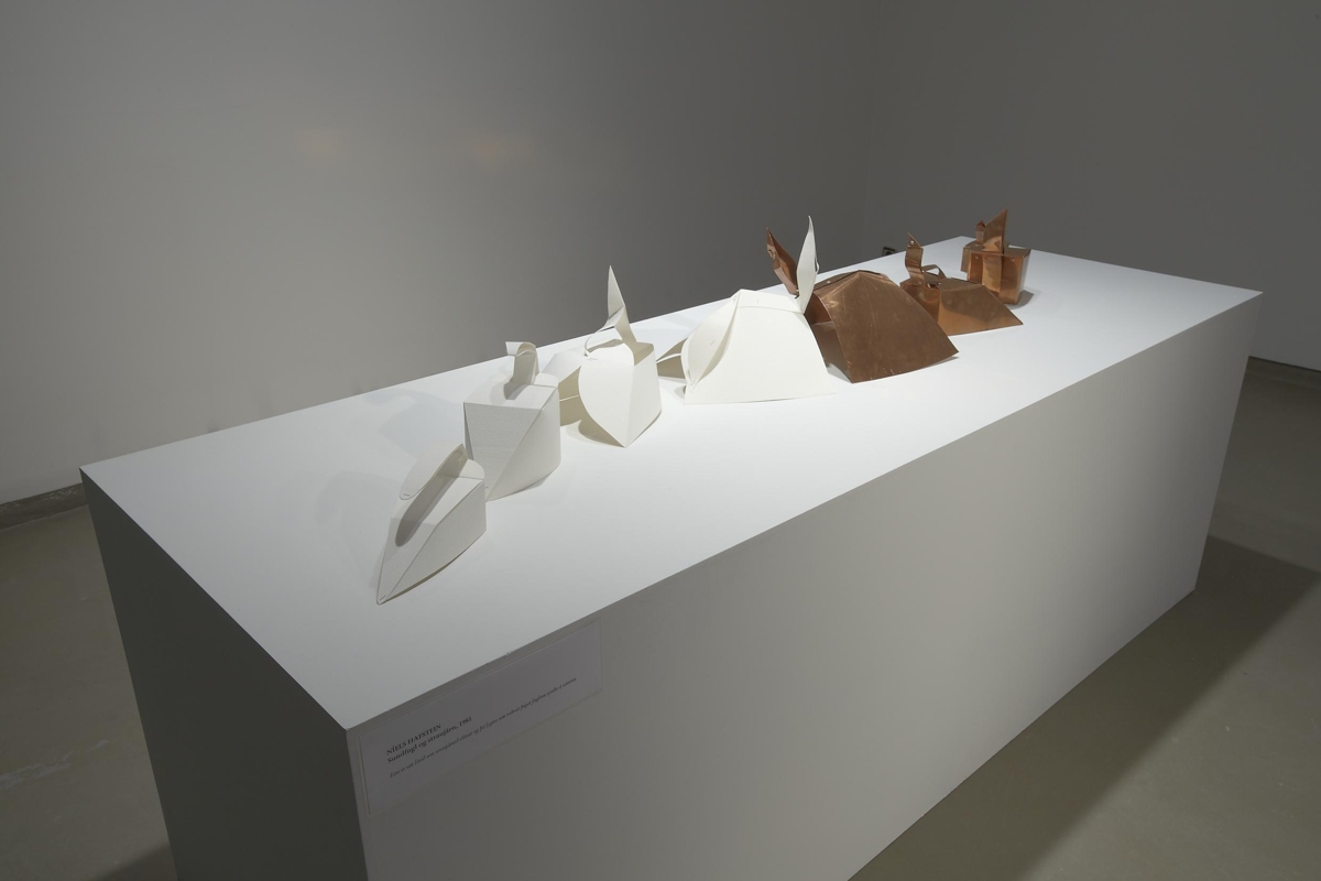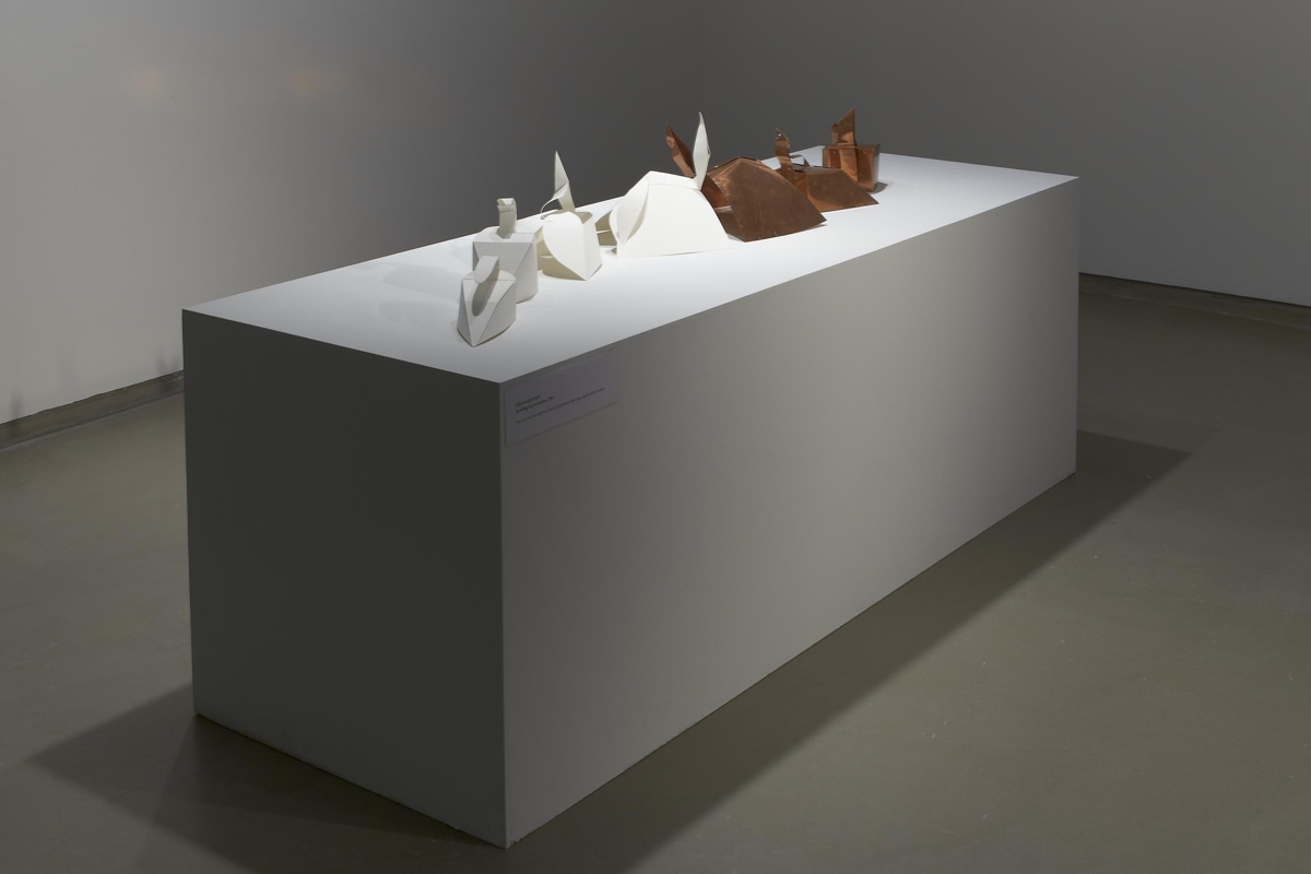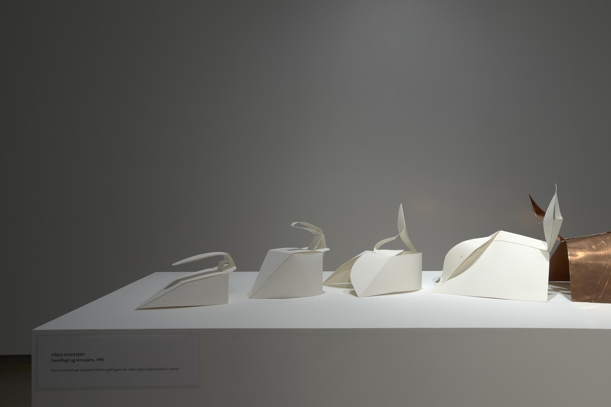 Verk í 8 einingum, kopar og þykkur hvítur pappír, 4 af hvoru ásamt eftirfarandi texti: Eins er um línið sem straujárnið sléttar og þá lygnu sem vaknar þegar fuglinn syndir á vatninu.