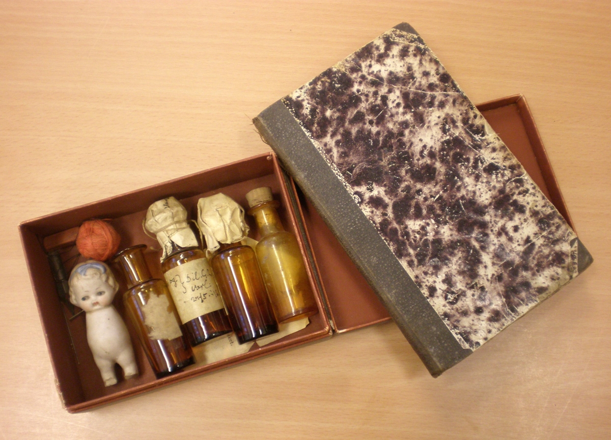 Box sem í eru: 4 hómópatíuglös, lítil handleggjalaus postulínsdúkka, 7 cm og dönsk kennslubók í hómopatíu, gefin út í Kaupmannsahöfn síðari hluta 19. aldar.