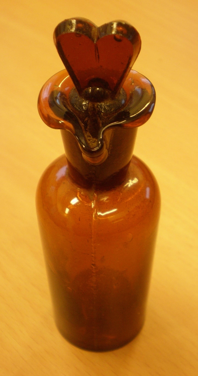 Dropaglas með stút úr brúnu gleri, 10.5 cm á hæð með glertappa.
