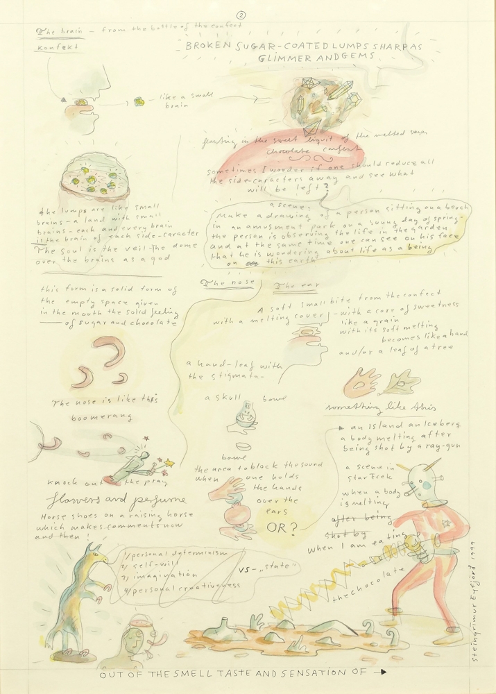 Fjórar litaðar teikningar, 70 x 50 cm hver.