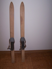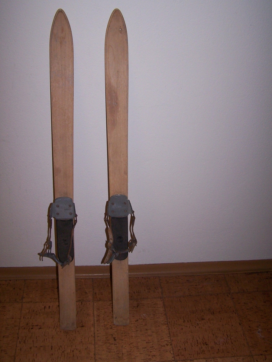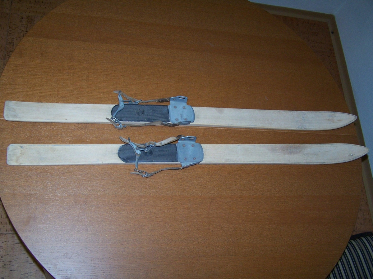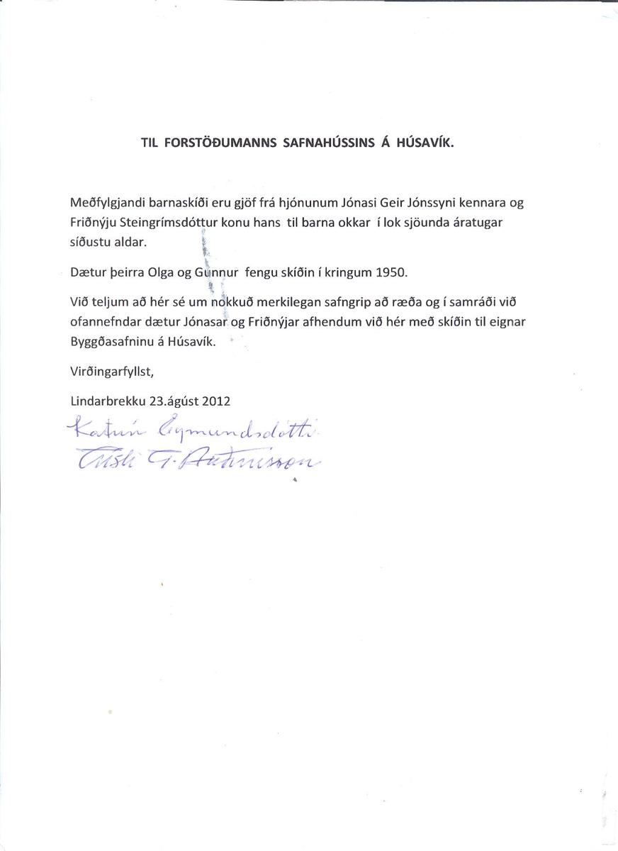 Barna tréskíði með áföstum bindingum. Katrín Eymundsdóttir og Gísli G. Auðunsson gáfu skíðin. Skíðin höfðu hjónin Jónas Geir Jónsson kennari og Friðný Steingrímsdóttir gefið börnum Katrínar og Gísla í lok sjöunda áratugs tuttugustu aldar. En dætur Jónasar og Friðnýjar Olga og Gunnur fengu skíðin í kringum 1950.