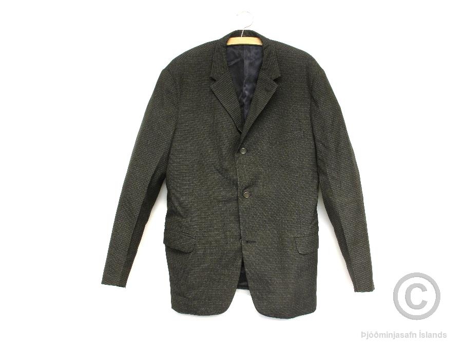 Karlmannsjakki úr smáköflóttu ullarefni, svarblár í grunninn en munstrið myndað úr grænum og rauðbrúnum þráðum. Hnepptur með þremur steingráum plasttölum. Hann er með tveimur vösum og brjóstvasa. Fremst á ermum eru tvær tölur til skrauts. Jakkinn er fóðraður með dökkbláu satínefni en ermarnar með hvítu satínefni með bláum og brúnum röndum. Jakkinn er framleiddur í Fataverksmiðjunni Gefjuni Reykjavík og merktur henni við brjóstvasa að innanverðu. Jakkinn er í mjög góðu ástandi en fóður hefur slitnað eilítið fremst í ermum og hefur verið viðgert.