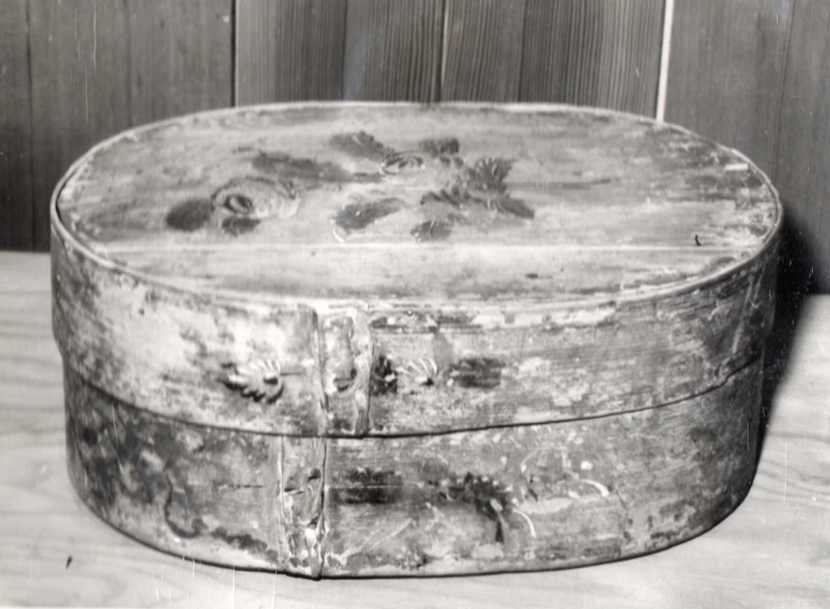 Trafaaskja, ljósblá með rósum. Lengd 33 cm, breidd 22 cm, 13 cm. Átt hefur Guðrún Ketilsdóttir frá Ketilhúshaga Rangárvöllum, f.1840 d.1909, kona Jóns Péturssonar frá Helluvaði. Þau bjuggu á Stokkalæk. Gjöf frá Jóni Egilssyni hreppstjóra Selalæk. Guðrún var amma hans. 14.5.1960.