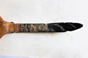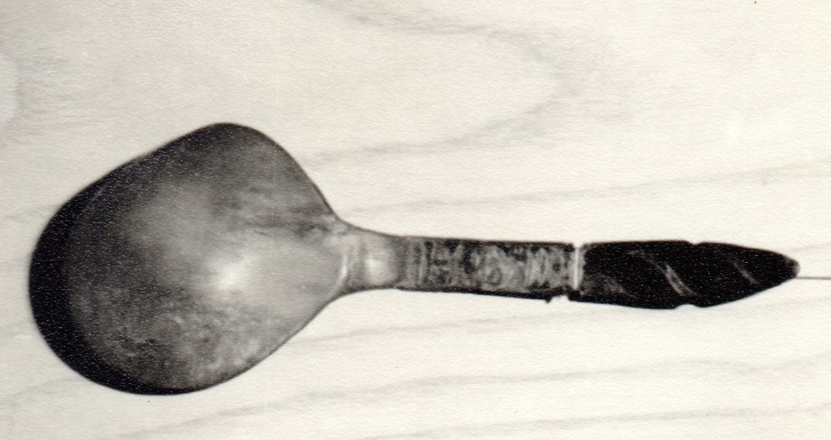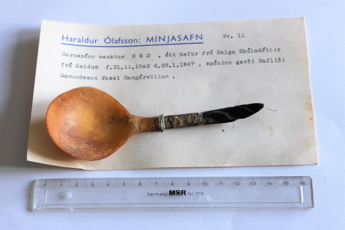 Hornspónn merktur H.S.D., 13 cm. Átt hefur Helga Skúladóttir frá Keldum f. 21.11.1902, d. 28.1. 1947, kona Jóns Egilssonar frá Stokkalæk. Þau bjuggu í Gunnarsholti og síðar á Selalæk. Hafliði Sæmundsson á Fossi gerði spóninn. Gjöf frá Jóni Egilssyni.