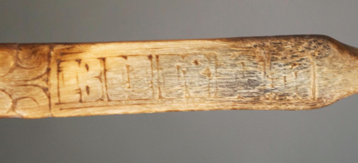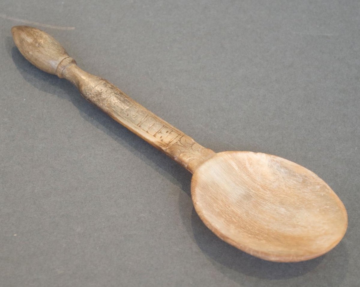 Hornspónn = 16 cm. Merktur BORGA. Átt hefir Vilborg Halldórsdóttir biskupsdóttir frá Hólum, f. 1740 d. 18.11.1821., kona Beinteins Ingimundarsonar lögréttumanns, sjá færslu við mun HÓ-16. Spóninn gaf mér Páll Sigurðsson í Árkvörn.