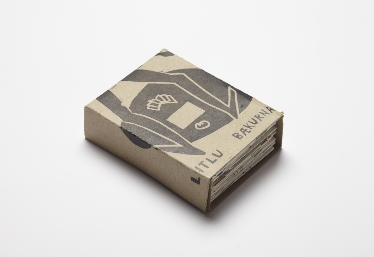 16 hlutir í bókbandspappa öskju, sem er með svartri dúkristu; 14 heftaðar smábækur/hefti í ca. A7, 16 síður hver, tvær bækur brettar A4 arkir í A7. Svarthvítt og litprentaðar teikningar og texti, sumar með prenti á báðum hliðum auk sumra með undirskrift eða handteikningu. Verk eftir 16 listamenn. Verkið er hluti af seríunni Litlu bækurnar, útgefið af Helga Þorgils Friðjónssyni. Listamennirnir voru beðnir um að vinna bók í A7 stærð úr A4 örk. Dæmi um einfalda og ódýra útgáfu á bókverkum. Upplag 200 eintök, sum tölusett.