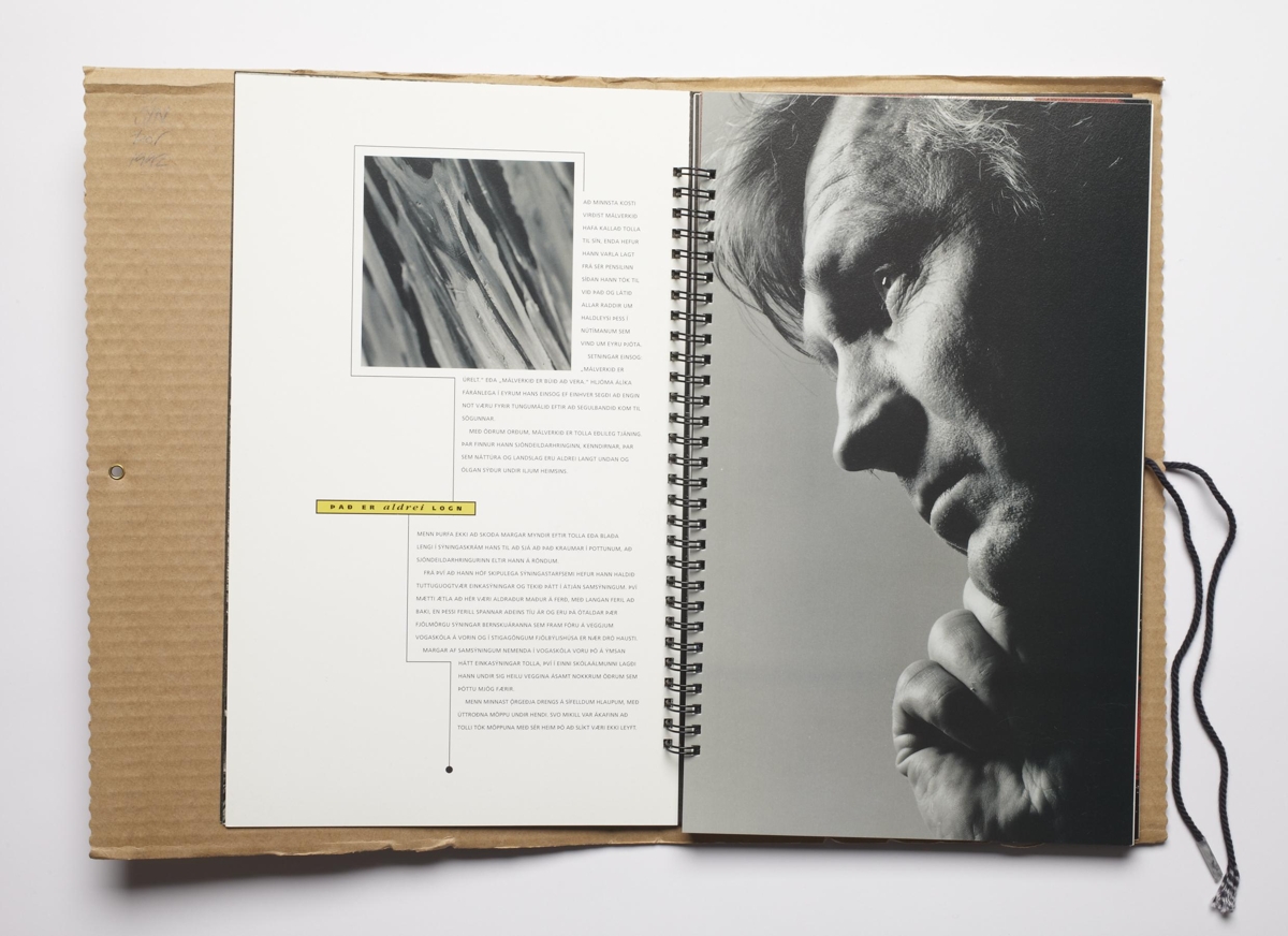 The artist’s book consists of images of paintings by Tolli. The work is 79 unnumbered pages in colour print on half-glossy pages. The work begins with a text on Tolli’s artwork by Einar Már Guðmundsson. The artist’s book is divided into chapters of older, younger and black and white works. The book is in wire binding with a hard cover. The artist’s book was published in connection to an exhibition of Tolli’s works at the ASÍ art museum in the year 1992. The book was published in 1000 copies, thereof 300 numbered and signed copies.