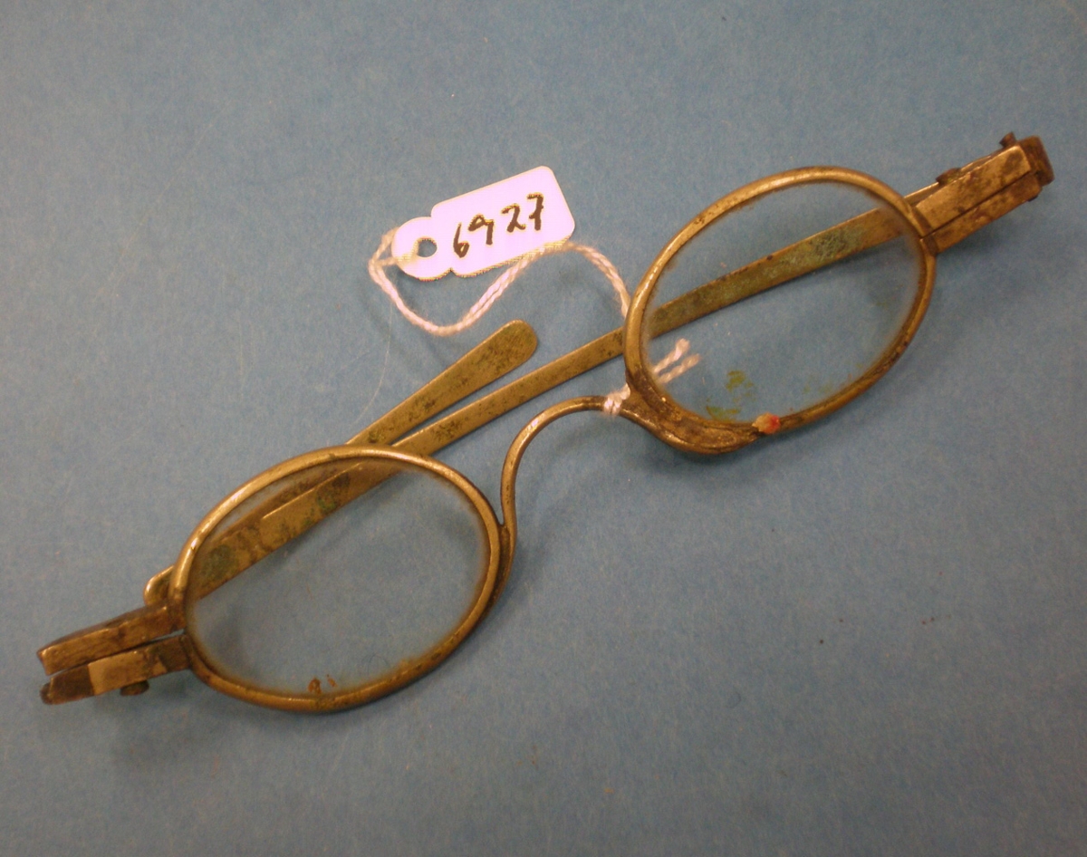 Gömul gleraugu með látúnsumgjörð. Aðra spöngina vantar.