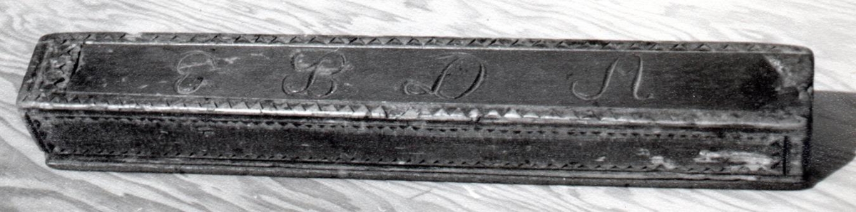 Prjónastokkur, lengd 30,5 cm, ártal 1856 á botni, en á loki eru stafirnir E.B.D.Á., það er Elín Bjarnadóttir húsfreyja á Keldunúpi á Síðu móðir frú Guðríðar Þórarinsdóttur á Blómsturvöllum. Keyptur 22.7. 1958.