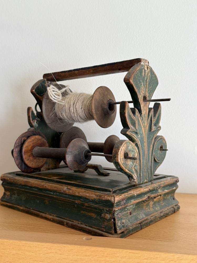 Snældustóll úr tré fyrir 3 snældur og geymsla undir loki, talinn smíðaður af Helga Magnússyni í Hörgslandi á Síðu. Keyptur af Þórönnu Þórarinsdóttur húsfreyju á Núpsstað.22.7.1958.
