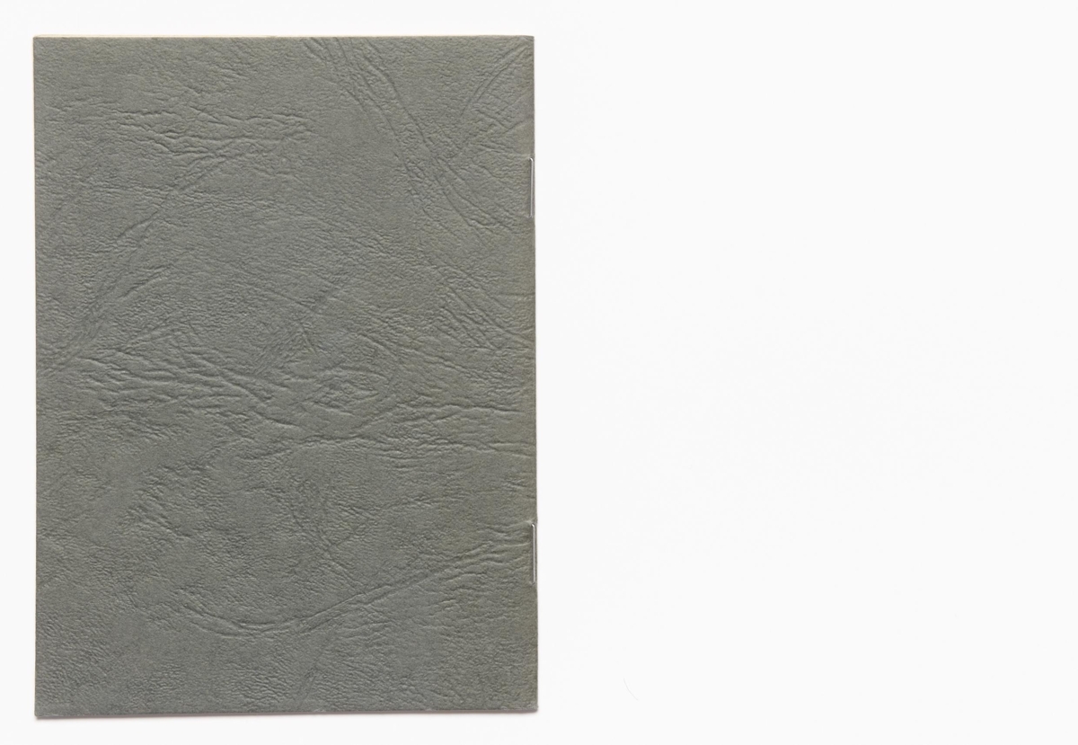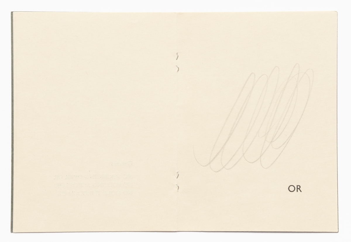 The artist’s book is a concept work composed of typed out words and handmade interventions on it’s pages. The book is 12 unnumbered pages in black print on matte paper. The work is in staple fold binding with a soft cover. The text and handmade changes are on the right-hand page. The artist’s book was published in 1973 in 100 numbered and signed copies.