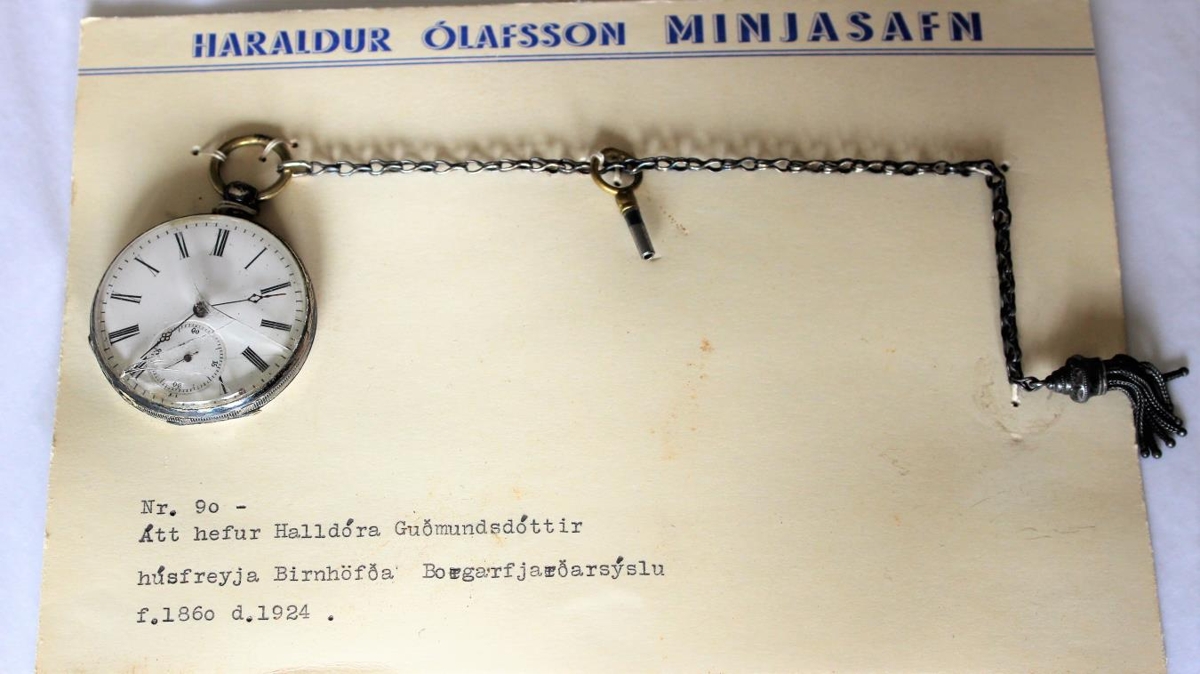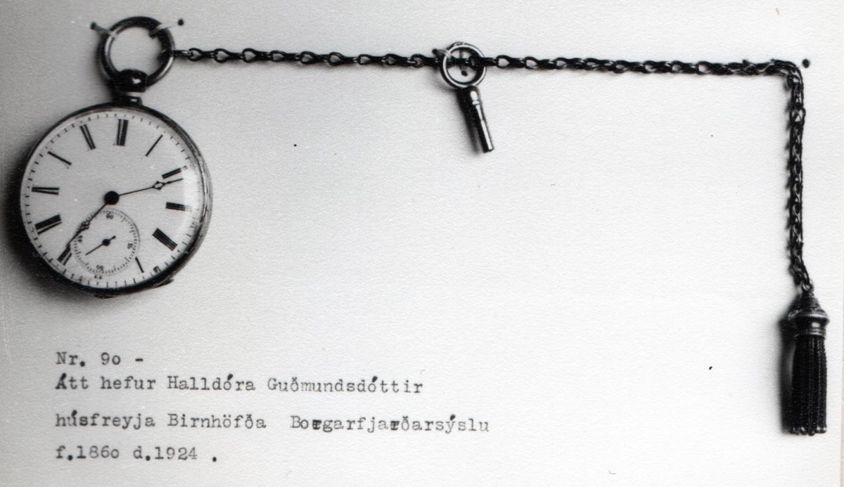 Kvenúr með lykli og keðju með silfurskúf. Átt hefur Halldóra Guðmundsdóttir Birnhöfða Borgarfjarðarsýslu f. 1860 d. 1924. Gjöf frá Sesselju Jörundardóttur Rv. Hvít skífa með svörtum rómverskum tölum.