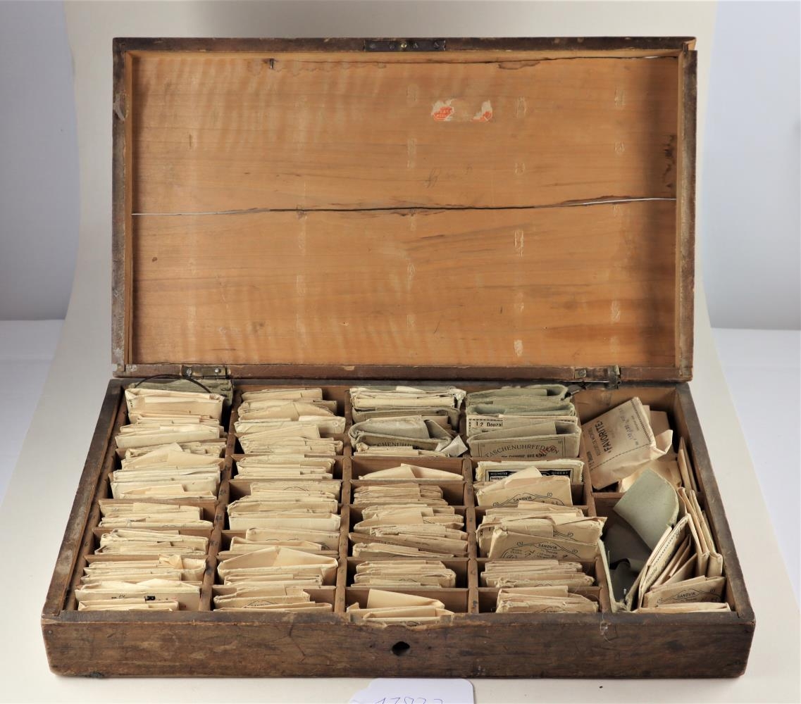 Kassinn er hólfaður með mörgum hólfum og í þeim eru ótalmargir litlir pakkar með mismunandi stórum fjöðrum í úr. Kemur af úrsmíðavinnustofu Magnúsar Benjamínssonar, Veltusundi 3.