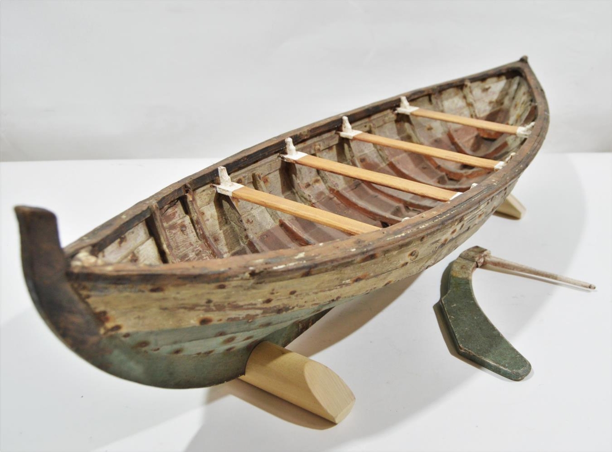 Líkan af árabát, málaður grænn og brúnn. Mikið negldur.