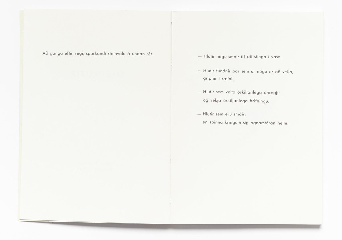 Verkið er prentaður texti, teikningar og ljósmyndir á hálf-glans pappír, samtals 76 ótölusettar blaðsíður. Verkið samanstendur af 35 ljósmyndum af ýmsum smáhlutum og samsvarandi teikningum þar sem útlínur hvers hlutar eru teiknaðar upp, teikning og ljósmynd á hverri opnu. Texti á íslensku. Bókin er límbundin með mjúkum spjöldum. Upplag er 100 árituð og tölusett eintök.