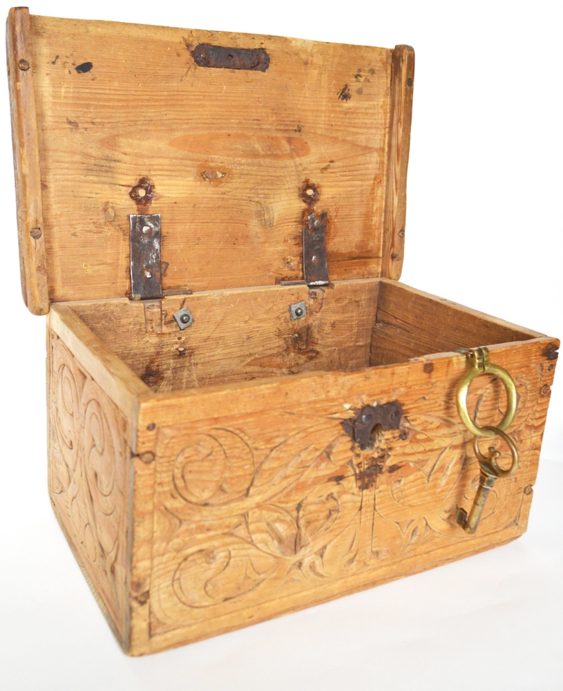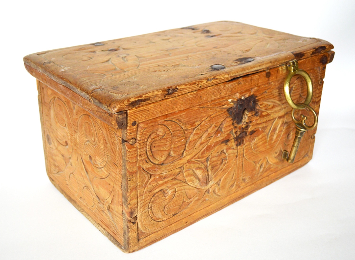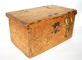 Útskorinn kistill, breidd 21,5 cm, hæð 19 cm, lengd 33,5 cm, með járnlömum og hluta af skráarlaufi, en skráin er farin af. Koparlykill á hring fylgir. Kistilinn hafa átt Guðrún Sturlaugsdóttir frá Kolsstöðum Dal. f. 1800 og dóttir hennar Málfríður Sigurðardóttir f. 1830 kona Guðm. Hannessonar hita Vatn...[óskýrt letur] og dóttir hennar Halldóra Guðmundsdóttir f. 1860 d. 1924, kona Jörundar Hákonarsonar Birnhöfða Borgarf. Dóttir hennar Sesselja Jörundardóttir f. 1897 gaf mér 13.3. 1964.