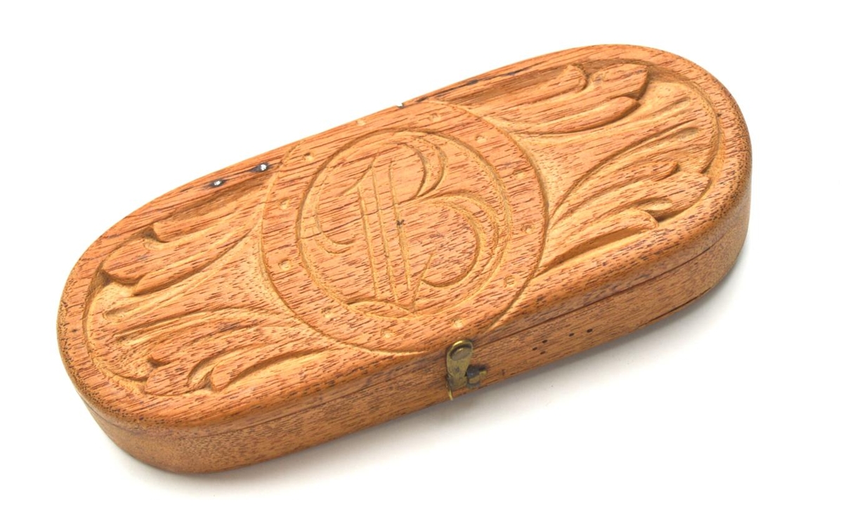 Skegghnífsstokkur. Lengd 20 cm, breidd 7,5 cm, þykkt 3,5 cm. Útskorið lok merkt B. Í stokknum eru tveir skegghnífar. Stokkinn útvegaði mér Birgir Thoroddsen skipstjóri á Lagarfossi. Er stokkurinn talinn vera úr eigu Brynjólfs Bogasonar Benedictsen í Flatey Breiðafirði. 1.7. 1967.