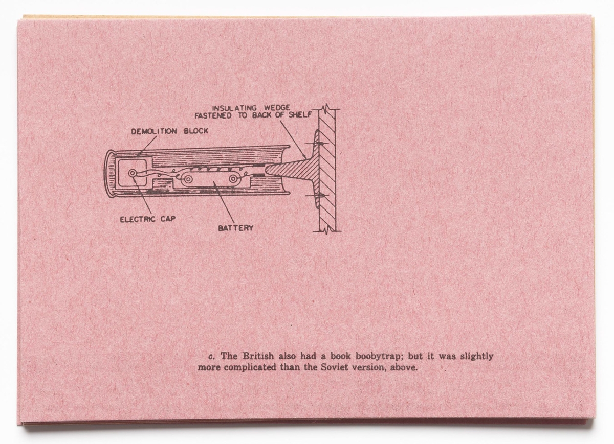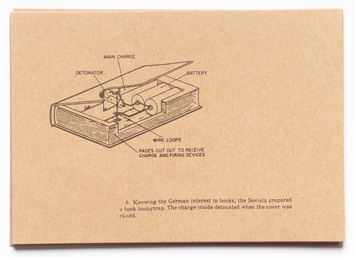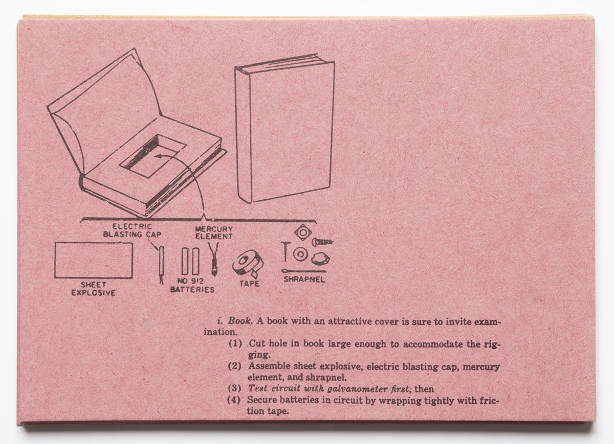 Verkið er 17 pappírskort í tveimur litum með prentuðum myndum og texta í svörtu á báðum hliðum. Það inniheldur 16 myndskreytingar með texta, sem fenginn er úr handbók Bandaríkjahers, með upplýsingum um sprengigildrur, FM 5- 31, gefin út 1965. Myndskreytingar og texti hafa verið aðlagaðar að stærð kortanna. Í verkinu má finna þrjú dæmi um sprengigildrur búnar til úr bókum. Kortin eru pökkuð í olíupappír, eitt þeirra notað sem titilsíða. Upplag er 50 eintök.
