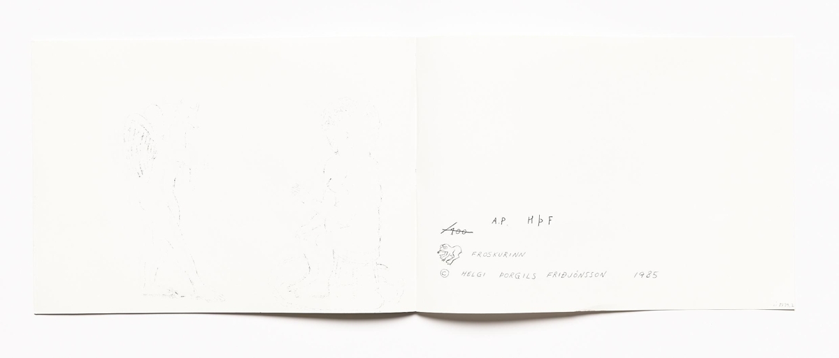 The artist’s book consists of drawings by Helgi Þorgils Friðjónsson. The book is ten unnumbered pages in black print on matte paper. The book is in staple fold binding with a soft cover. The drawings are printed on the right-hand pages. The artist’s book was published by Helgi Þorgils Friðjónsson in 1985. The edition is 100 numbered copies. The artist’s book in the museum’s collection is signed with A.P. (artist’s proof).
