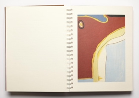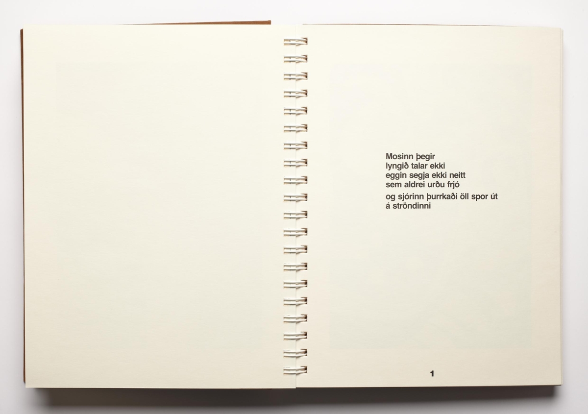 The artist’s book consists of poems by Thor Vilhjálmsson and paintings by Örn Þorsteinsson. The poems and images are eighteen each. The artist’s book is 64 pages in colour print on matte paper. The text and images are printed on right-hand pages, where text or image cover the page. The book is in wire binding with a hard cover. The artist’s book was published in 1988 in 200 numbered and signed copies.