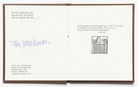 The artist’s book consists of poems by Thor Vilhjálmsson and paintings by Örn Þorsteinsson. The book is 30 unnumbered pages in black print on matte paper. The book is in case binding with a hard cover. The artist’s book was published in 1982 in 250 numbered and signed copies.