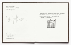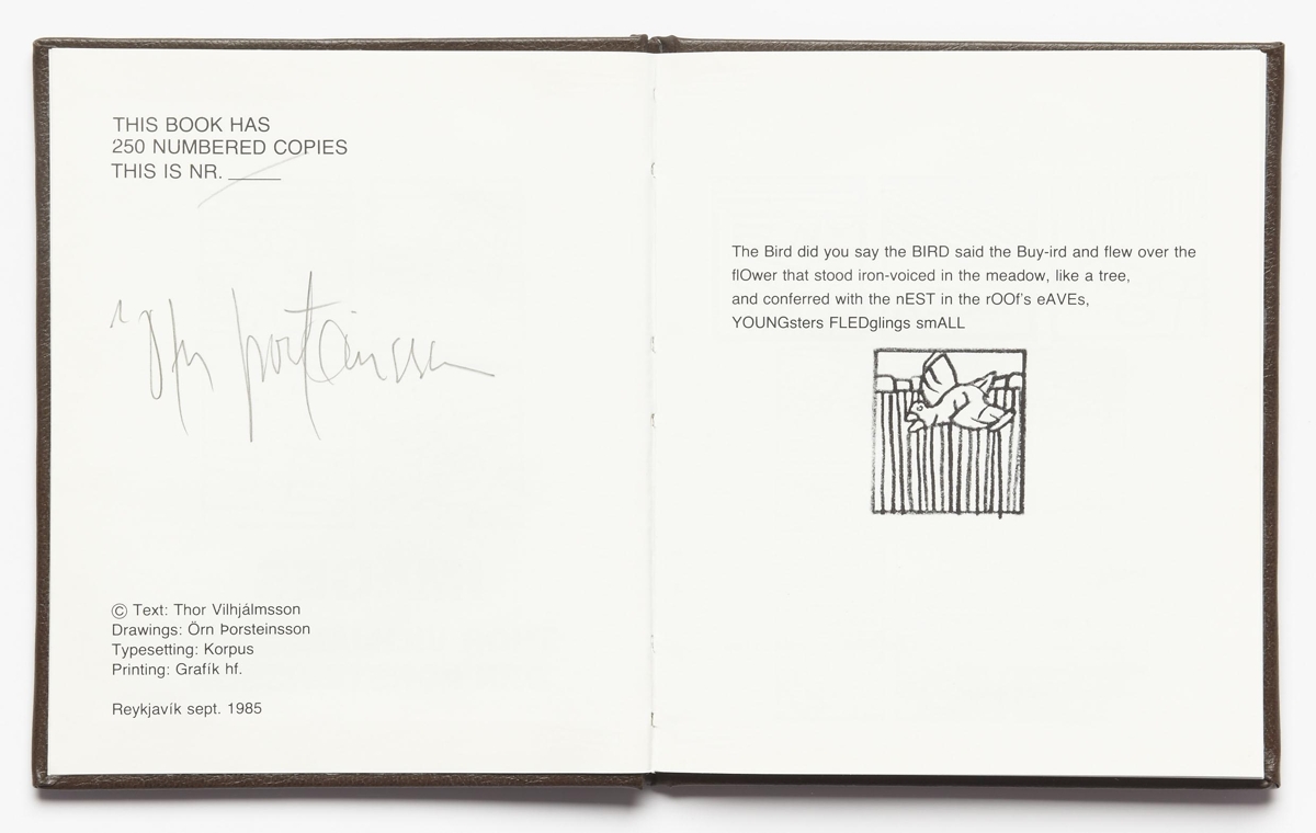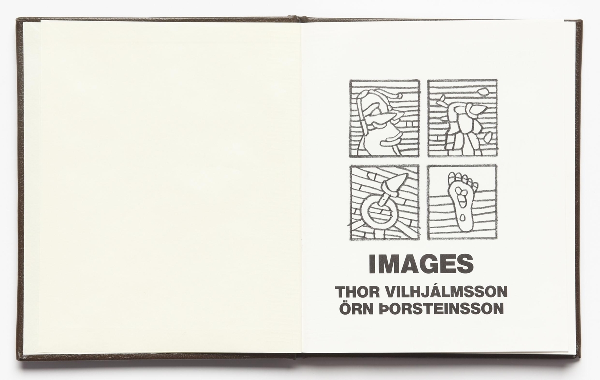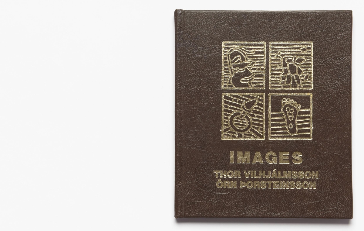 The artist’s book consists of poems by Thor Vilhjálmsson and paintings by Örn Þorsteinsson. The book is an English version of the book LJÓÐ MYNDIR. The artist’s book is 30 unnumbered pages in black print on matte paper. The book is in case binding with a hard cover. The artist’s book was published in 1985 in 250 numbered and signed copies.