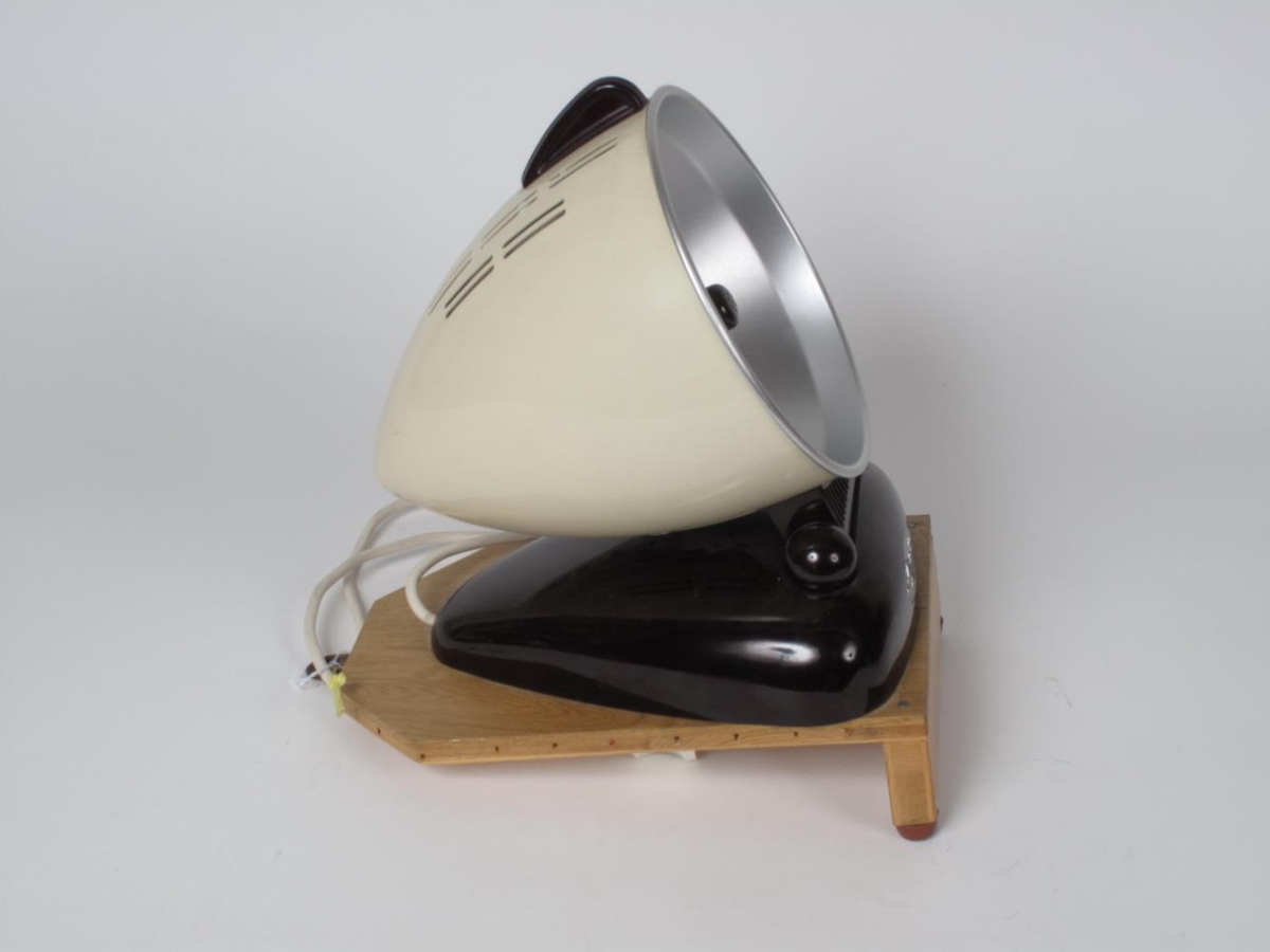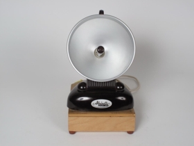 Nettur Alpinette ljósalampi sem hefur til hægðarauka verið festur á tréstand.Lampinn var notaður í lok 7. áratugarins á heimili Emmu og Þorgils læknis Benediktsson.Kom ásamt gleraugum sem notuð voru með lampanum og mynd af börnum í ljósabaði.