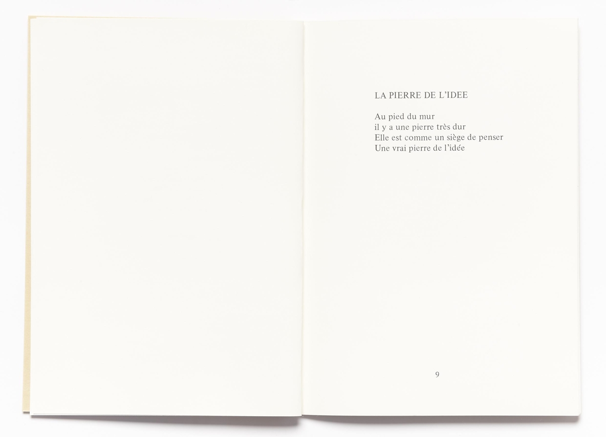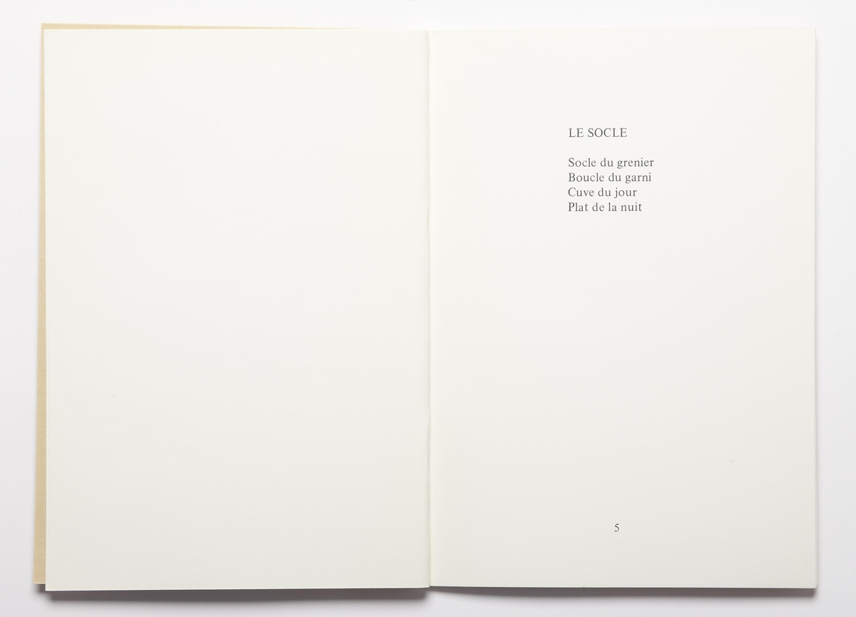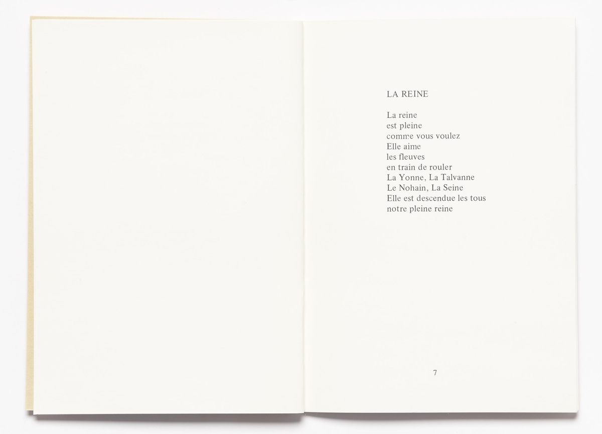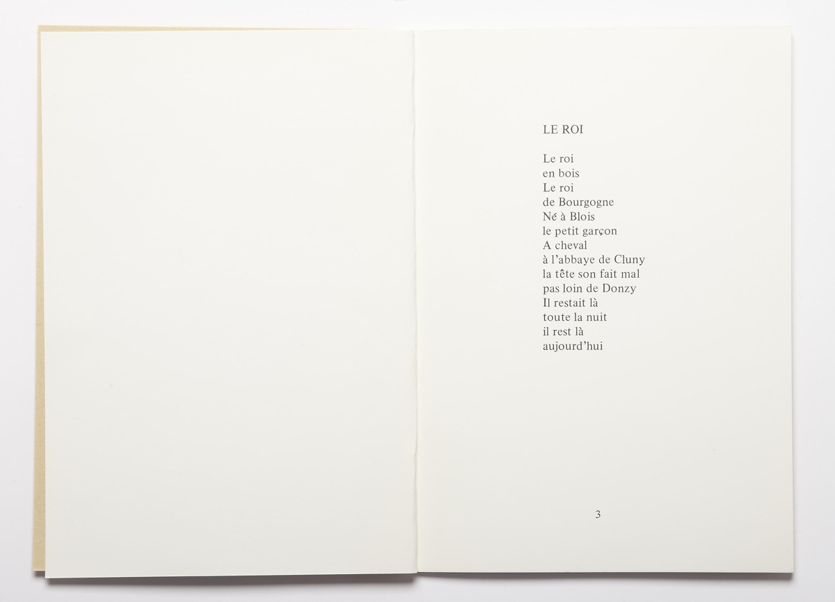 Verkið er 21 blaðsíða, texti í svörtu á glanspappír, prentaður hægra megin síðu. Bókin er safn ljóða á frönsku. Límbundin með ljósbrúnum spjöldum. Upplag 500 eintök.