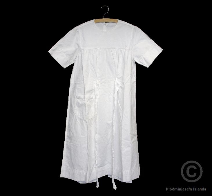 Hlífðarsvunta úr hvítu lérefti, heilsvunta með stuttum ermum. Hneppt að aftan með tveimur tölum nálægt hálsmáli. Að framanverðu er einn vasi og borðar sem svo eru bundnir saman um mittið að aftanverðu. Svuntan nær niður fyrir hné. Hún er í góðu ástandi en út frá öðrum mittisborðanum hefur léreftið einhvern tíma rifnað og þar er viðgerð. á fald innanverðan að neðan, öðrum megin, hefur verið stimplað eða skrifað: Hsj. Á faldi innanverðum (sést ef efnið er borið upp að ljósi og horft í gegn) eru auk þess stafirnir: H.s.11956.