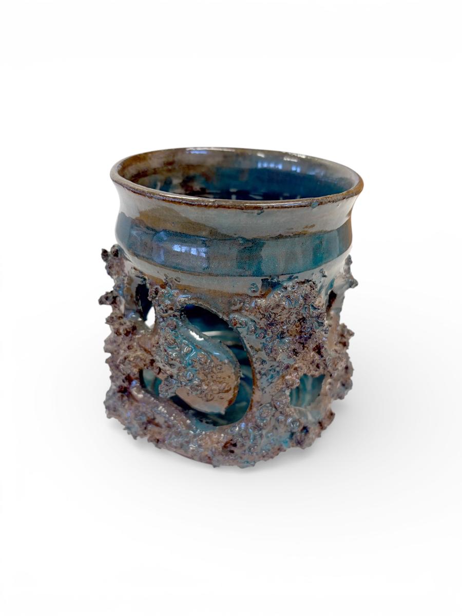 Hraunaður vasi með götum eða hugsað fyrir kerti. Frá Glit. Litir: brúnn og grænn.
