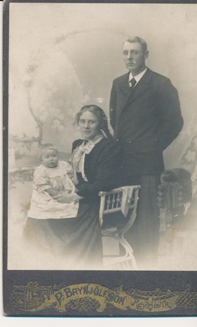 Hjón með barn, hjónin Gísli Jónsson og Ásta Guðmundsdóttir, og dóttir þeirra Ásthildur Gísladóttir, f. 28. febrúar 1903. Á bakhlið stendur: "Til frú Guðm. Nielsen með kærri kveðju frá Ástu og Gísla 4/12. ´03."