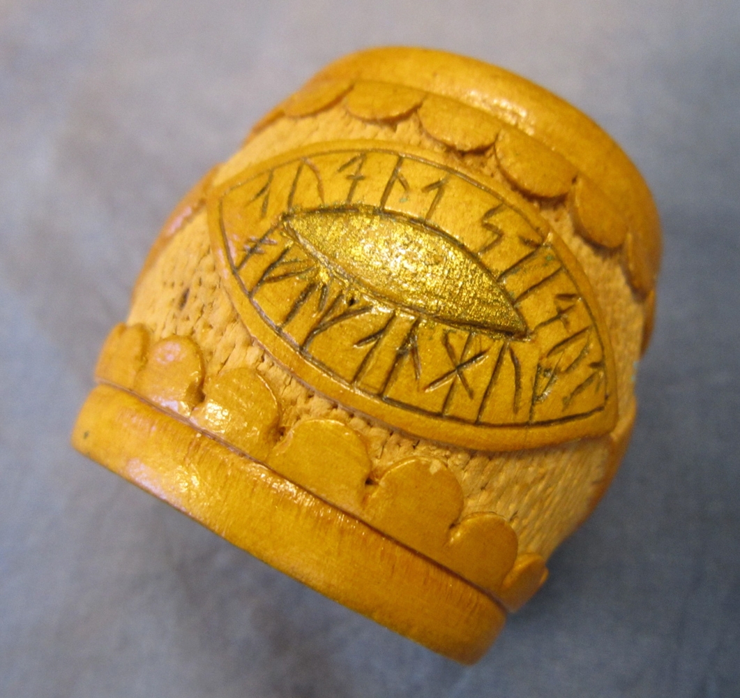 Útskorinn servíettuhringur úr ljósum viði með rúnaletri og stöfunum „K.V. 1928“