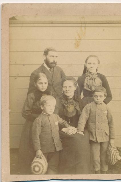 Fjölskyldumynd. Guðmundur bóksali á Eyrarbakka, Ástríður kona hans og fjögur börn þeirra. Oline Lefolii tók myndina um 1890.