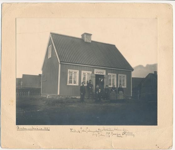 Timburklætt hús með stétt fyrir framan aðaldyr. Guðmundarhús eða Kirkjuhús árið 1887. Guðmundur Guðmundsson bóksali og Ástríður Guðmundsdóttir kona hans ásamt börnum þeirra og hjúum. Einnig Friðrik bróðir hans.