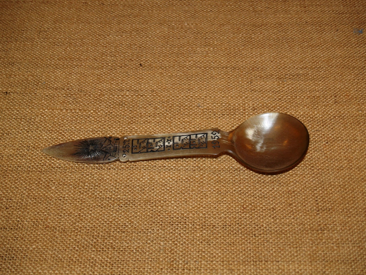 Spónn útskorinn með áletrun 25. júí 1959. Spónn útskorinn og gefinn Kristjáni frá Djúpalæk af Ríkarði Jónssyni í tilefni af fæðingu sonar Kristjáns, 25. júlí 1959.