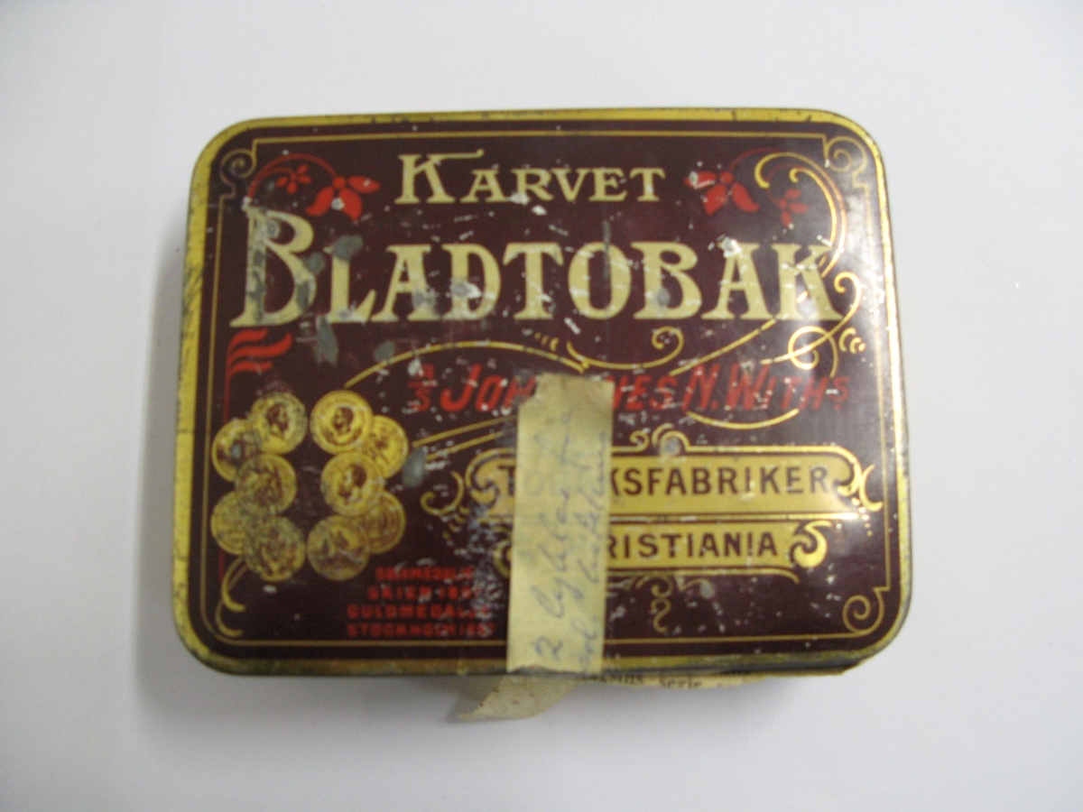 Gylltur kassi með brúnu loki með hvítum, rauðum og brúnum stöfum, undan tóbaki. Á kassanum stendur: Karvet Bladtobak A/S Johannes N.With´s Tobaksfabriker. Tvö brot af stækkunarglerjum er í honum og hefur líklega verið heilt kringlótt gler sem hefur brotnað. Tveir lyklar af Hotel Misson og Victora eru í þessum kassa sem hafa no. MA-1984-118 og 119.