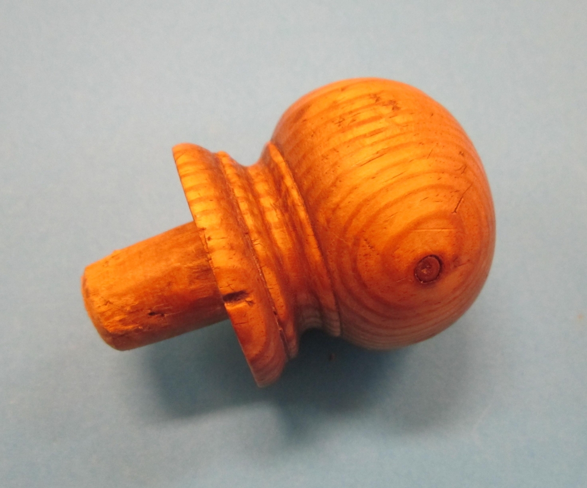 Hnúður af rúmi, renndur úr tré af Jóni Samúelssyni, Hofstöðum, þvermál 5 cm.
